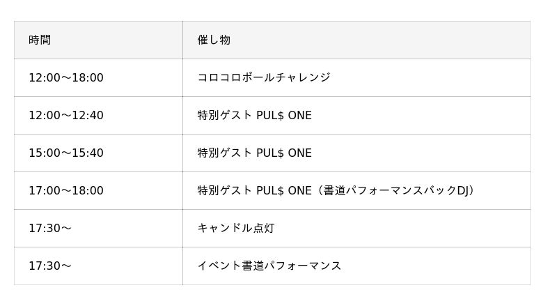さらに、迫力ある書道パフォーマンスやゲストDJによる音楽、お子様が景品をもらえる「コロコロボールチャレンジ」など、盛りだくさんの内容です。