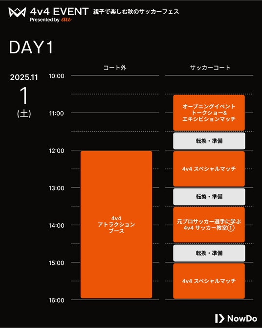 KDDI株式会社(所在地:東京都港区、代表取締役社長 CEO:松田 浩路、以下 KDDI)は、育成年代向けの4人制サッカー「4v4」を運営するNow Do株式会社(所在地:東京都新宿区、代表取締役社長:本田 圭佑)と共催し、2025年11月1日(土)・2日(日)に、たまプラーザ テラス のノースプラザ(東急百貨店 たまプラーザ店) 3階 庭園 COMMON FIELD(神奈川県横浜市青葉区美しが丘一丁目7番地 )にて、小学生とその親世代を対象とした「4v4 EVENT Presented by au 親子で楽しむ秋のサッカーフェス」(以下、本イベント)を開催します。本イベントは、本田圭佑が考案した新しい4人制サッカー「4v4」を親子で気軽に体験できる、週末のおでかけにぴったりのイベントです。