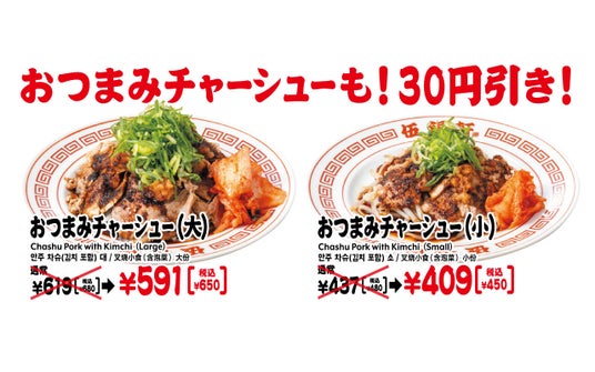 期間限定で、人気の「おつまみチャーシュー」が30円引き。角煮ラーメンとあわせて、さらに満足度アップ。