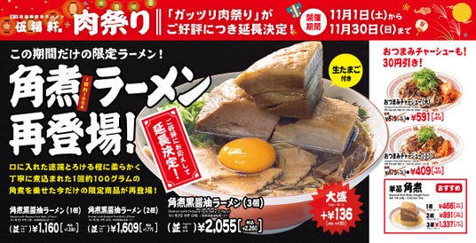 大好評につき、11月30日(日)まで延長!期間限定『肉祭り』では、豪快な「角煮ラーメン」と人気の「おつまみチャーシュー」をお楽しみいただけます。