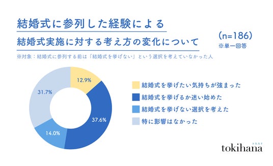 2025年1月にトキハナが実施した20~30代対象の調査では、結婚式を挙げる予定だったにもかかわらず、参列をきっかけに悩み始めた人が51.6%にのぼり、「費用」「準備の大変さ」「注目を浴びることへの抵抗感」を実際に目の当たりにし、"挙げる"から"挙げない"へと意識が変化する層が存在することが判明しています(https://prtimes.jp/main/html/rd/p/000000114.000027297.html)。