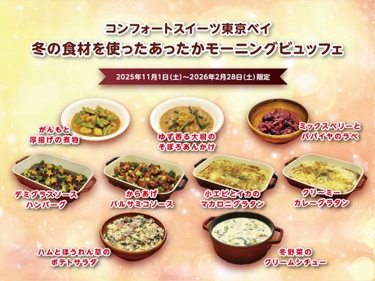 株式会社チョイスホテルズジャパン(本社: 東京都中央区、代表取締役社長: 伊藤孝彦、以下チョイスホテルズジャパン)が展開する「コンフォートスイーツ東京ベイ」(千葉県浦安市)は、2025年11月1日(土)から2026年2月28日(土)まで、朝食にて人気のレギュラーメニューに加え、冬の訪れを感じる計9種類の限定メニュー「冬の食材を使ったあったかモーニングビュッフェ」を提供します。