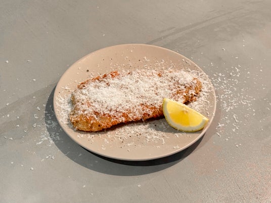 衣にチーズやペッパーを練り込み、香ばしく揚げたチーズカツレツ。仕上げに、テーブルでたっぷりとチーズを削りかけて仕上げます。