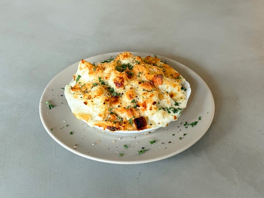 マッシュポテトの優しい甘みの上に、カリフラワーを重ね、濃厚な自家製ベシャメルソースをたっぷりかけて焼き上げました。