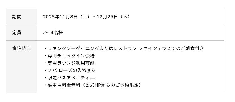 プレゼントの準備をするサンタのアトリエをイメージした「トイズ・クリスマスルーム」が室数限定で登場します。今にも動き出しそうなくるみ割り人形や、靴下の中に入ったテディベア、かわいらしいツリーに大きなリースがクリスマスの雰囲気を盛り上げます。こちらのプランでは、「専用ラウンジ」やスパでのご入浴など優雅で快適なホテルステイをお約束する特典をご用意。ベッドは最大4台設置可能で、ご家族やグループでのご滞在にもおすすめです。大切な方と過ごす特別なひとときを、クリスマスルームでお楽しみください。