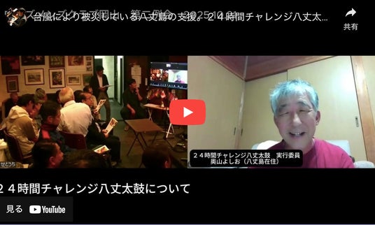先日の台風の被害で、「24時間チャレンジ八丈太鼓」の実施が危ぶまれています。予定しているサブ会場が被害も遭い、資金が不足しています。八丈島島民が元気を取り戻すためにみなさんのお力をお貸しください。