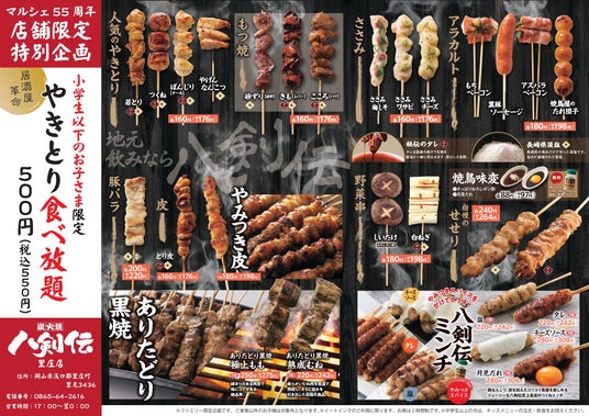 この度創業55周年を迎えたマルシェ株式会社は、地元密着型の居酒屋である八剣伝と地域とのつながりをより強めるための特別企画として、八剣伝 里庄店にて10月29日(水)~11月30日(日)の期間、ご家族で来店された小学生以下のお子様に向けてやきとり食べ放題を500円(税込550円)でご提供いたします。