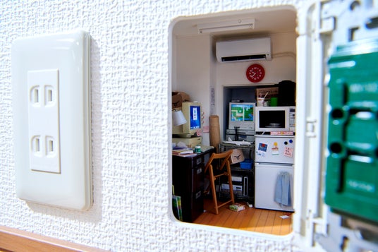「こびとの秘密基地」のテーマは"理想の空間"。生活を楽しむための最低限の物資を詰め込み、電子レンジには野菜スープがスタンバイしています。