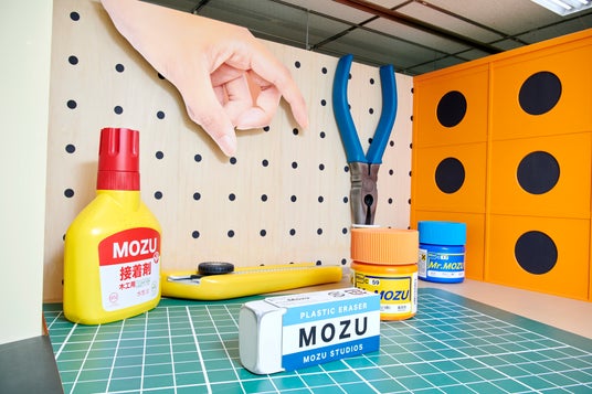 また、Mozuが実際に制作で使用する作業机を会場に再現。道具の配置や制作工程の跡を再現した展示は、作品がどのように生まれるかを直に感じられる貴重な機会です。