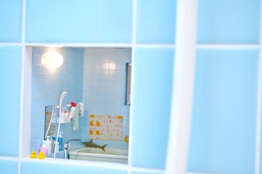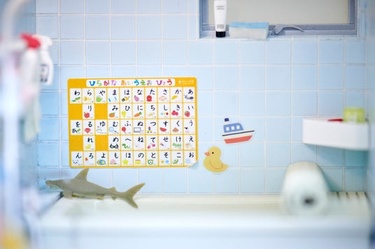「こびとのお風呂」は実家のお風呂場を思い出しながら制作。壁のひらがな表は端がめくれかかったり、お風呂の蓋はくるくる丸めることができます。
