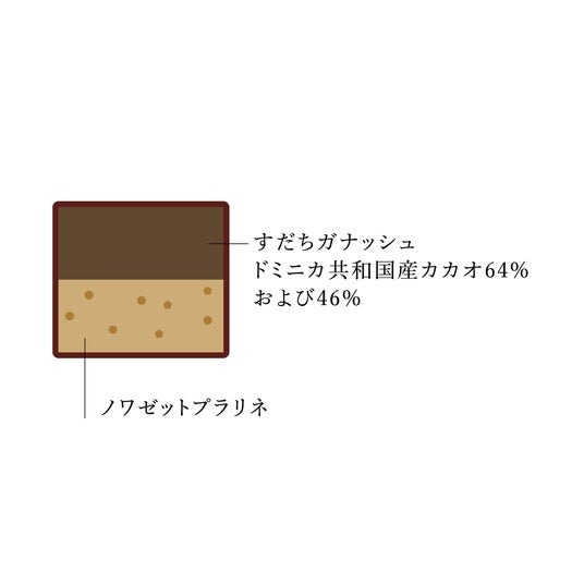 No.2 すだちノワゼット和柑橘の爽やかさとスパイシーさを合わせ持つ徳島県産の"すだち"。キレのある鮮烈な酸味のすだちをドミニカ共和国産カカオ64%と46%のショコラと合わせた香り高いガナッシュ。