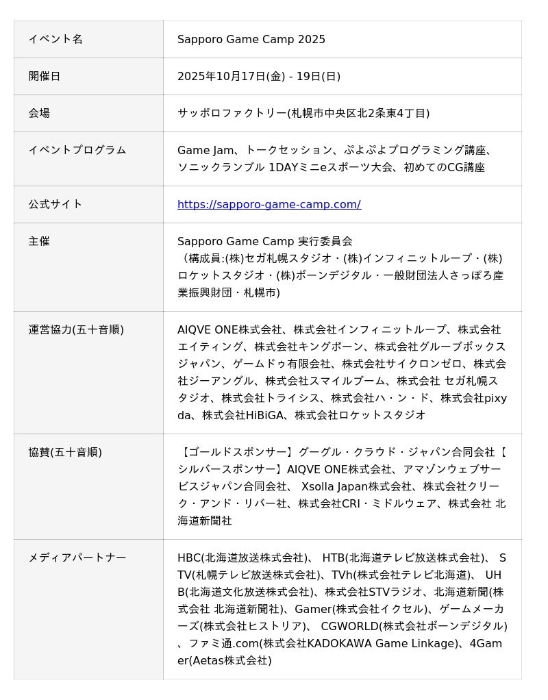 札幌市が参画するSapporo Game Camp実行委員会(実行委員長 瀬川隆哉(株式会社 セガ札幌スタジオ))は、札幌を基盤とするゲーム企業とともに、2025年10月17日(金)~19日(日)にかけて「Sapporo Game Camp 2025」(以下、SGC2025)を開催いたしました。