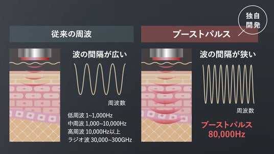 セラムブースターは、独自開発の高周波技術「ブーストパルス(80,000Hz)」を採用。温感ケアにより肌をやさしく温め、うるおいとハリ感のある肌印象へ導きます。