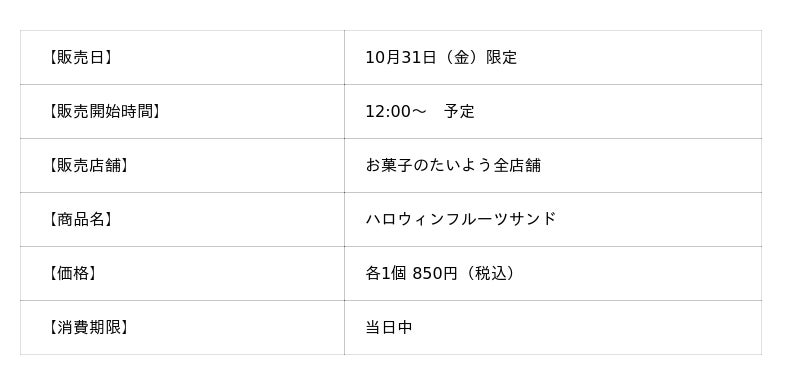 株式会社太陽社(所在地:千葉県匝瑳市飯倉293、代表取締役:片岡正裕)が展開する、千葉県で長年愛され続ける菓子店「お菓子のたいよう」では、ハロウィンスイーツのラストとなる第4弾、一日限定「ハロウィンフルーツサンド」を10月31日(金)12:00より、を販売いたします。