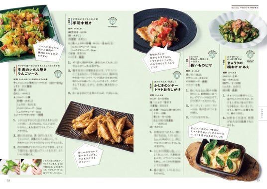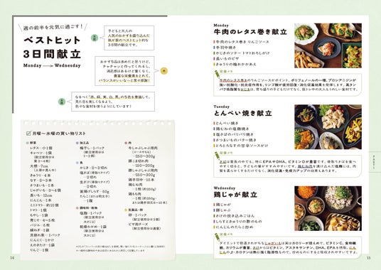 PART1では、6日分の献立を掲載。前半の3日間は元気に過ごせるベストヒット献立、週の後半はお疲れ気味の体に効く疲労回復に効果的な献立を紹介しています。各献立には3つの便利なポイント付きです。