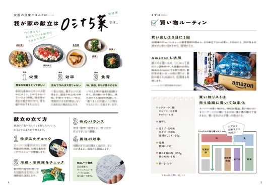 冒頭では毎日の献立づくりのコツだけでなく、ムダを省いて時短で済ませるための買い物ルーティンや時短調理ルーティンを紹介。