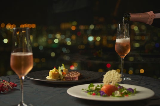 那覇の夜景を一望しながら味わう、クリスマス限定ディナーコースです。前菜には、海の幸のタルタルをスモークサーモンで包み、ビーツのジュレとキャビアを添えた華やかなクリスマス仕立ての一皿を。スープには、やんばる鶏のモモ肉と焼き茄子の旨みが溶け込んだコンソメスープをご用意しました。メインは和牛フィレ肉のグリルに彩り豊かな野菜を添えて、マデラソース トリュフ風味で上品に仕立てた一皿を提供。デザートには、パティシエからのスペシャルデザートをお贈りします。シャンドン ロゼのフリーフローとともに、特別な夜をお楽しみください。