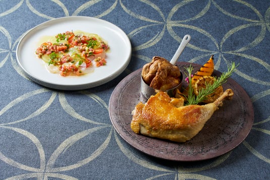 沖縄県産赤マチと島タコを季節の柑橘でセビーチェに仕上げた「赤マチと島タコのセビーチェ」(1,500円)、沖縄県産の久米島赤鶏のもも肉をコンフィにした「久米島赤鶏のコンフィ」(5,000円)、濃厚なチョコレートの風味とほのかなビター感が広がるケーキ「ミ・アメール・ノエル」(1,500円)を提供します。