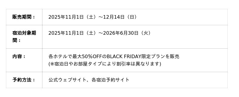 パートナーとの記念日、家族でのレジャー、もちろんビジネスにも。BLACK FRIDAY限定ステイ、最大50%OFFで予約開始