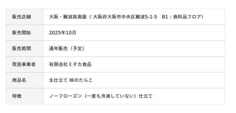 株式会社ヤマトバイオレッツ(本社:福岡県大野城市/ふくやグループ/代表取締役:梁川 剛一)は、OEM提供先である有限会社ミタカ食品(本社:大阪府)を通じて、2025年10月より大阪・難波高島屋での「生仕立て 味のたらこ/辛子明太子」の販売を開始いたしました。販売開始以来、「冷凍していない」という製法に注目が集まり、2度の入荷で即完売。早くもリピーターが発生するなど、百貨店デビューは上々の滑り出しとなっています。