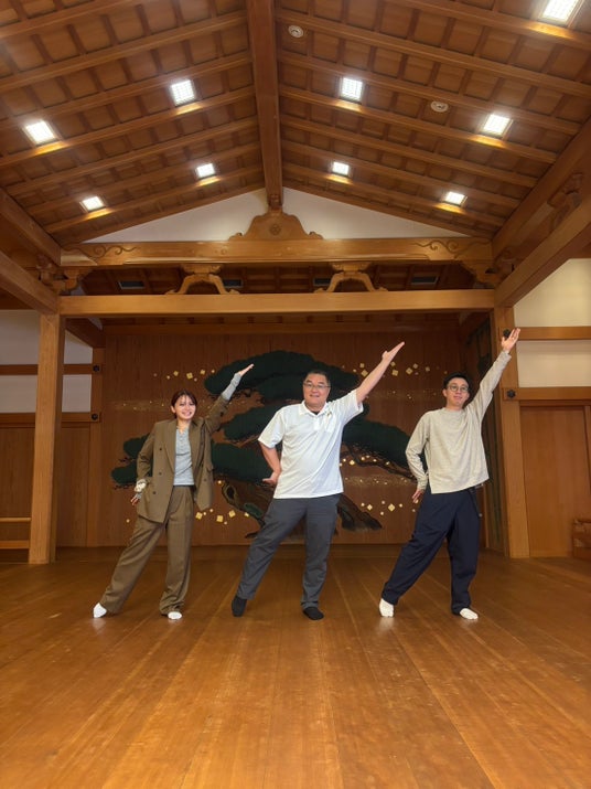 「木曽三川輪中ミュージアム」の能舞台で横川真澄市長(中央)とのスリーショット!