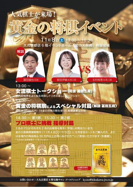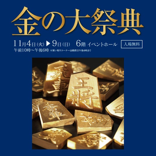 豪華な純金製品や将棋関連商品を展示販売。11月8日(土) には「黄金の将棋イベント」を開催!