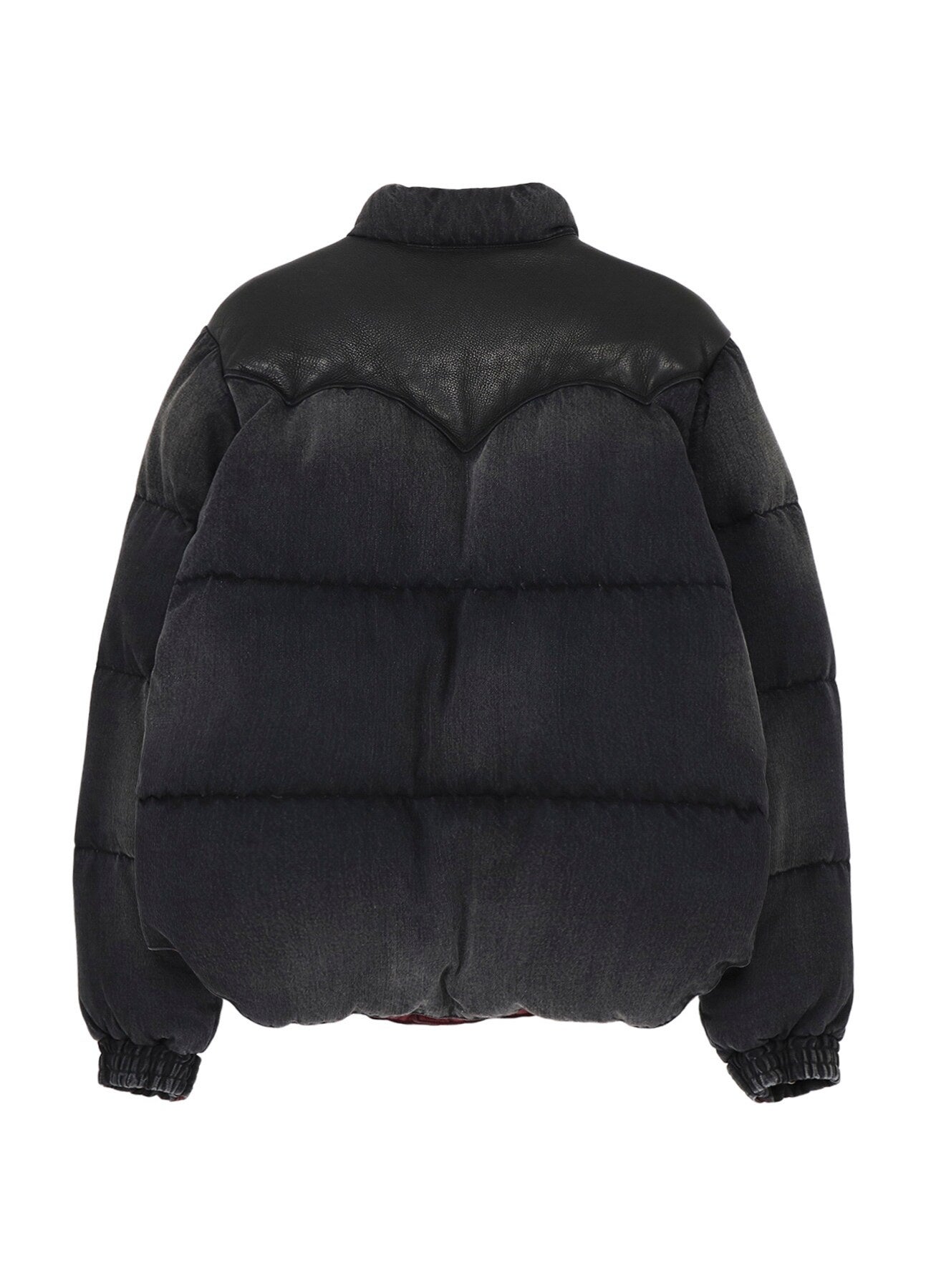 「Down Jacket Denim」は、日本製の硫化染めブラックデニム生地に自然なフェード加工を施し、着用するほどに経年変化を楽しめるアイテムです。ヨーク部分には洗濯可能なカウレザーを使用し、機能性も兼ね備えたデザインに仕上げています。