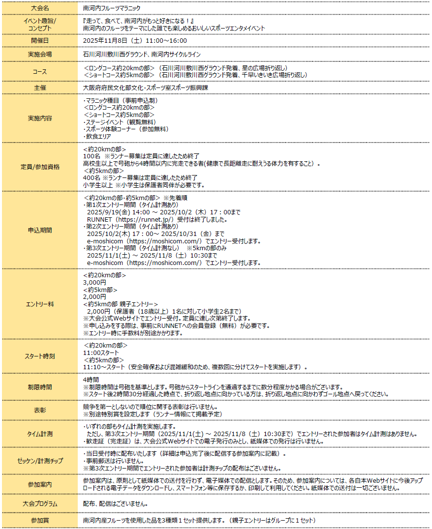 大阪府南河内地域の特産フルーツと自然を堪能しながら走る新感覚のランイベント「南河内フルーツマラニック」を、2025年11月8日(土)11時~16時に富田林市石川河川敷川西グラウンド、南河内サイクルラインで初開催いたします。本大会は、地域の魅力発信と健康増進を目的とし、ランナーだけでなく家族連れや観光客にも楽しんでいただけるイベントです。主催は、大阪府(スポーツ振興課)。