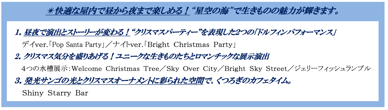 【内 容】閉館後の水族館ご入場+ナイトドルフィンパフォーマンス「Bright Christmas Party」