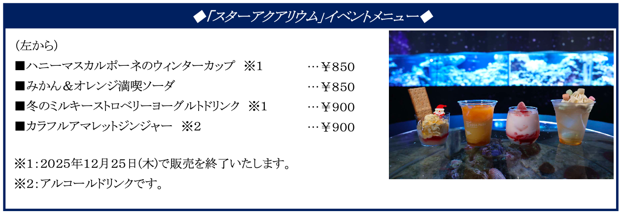 約3分間に一度、満天の星空につつまれるショータイムもあり、お好みのドリンクを片手にくつろぎの時間をお過ごしいただけます。館内でお持ち歩き可能なイベントメニューは、クリスマスにぴったりなスイーツや、赤×白でクリスマス感あふれるドリンクなど4種類をご用意しました。ご購入いただいた商品は館内でのお持ち歩きが可能なため、 ご見学のお供にオススメです。