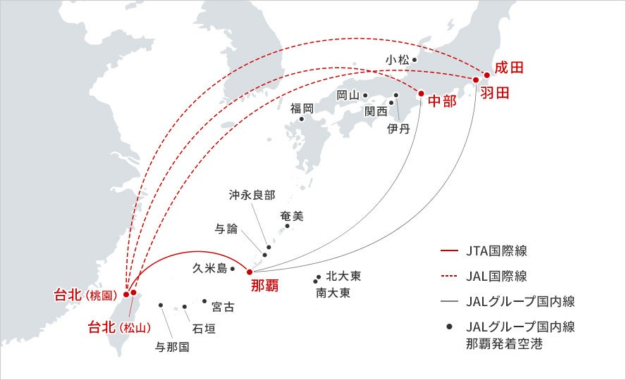 那覇=台北(桃園)線とJALグループの国際線・国内線を組み合わせることで、日本各地と台北を結ぶ周遊旅程が実現します。