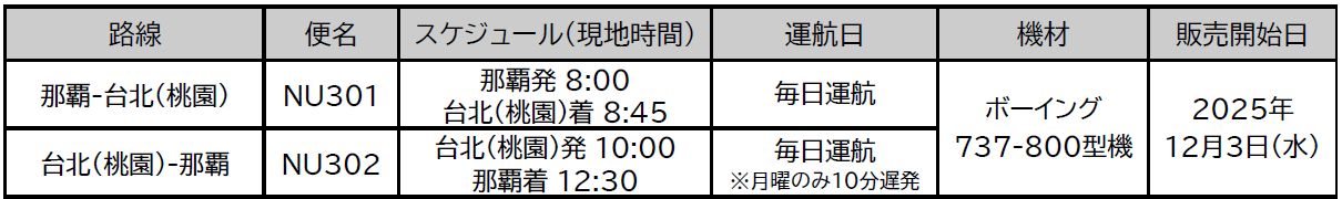 日本トランスオーシャン航空(本社:沖縄県那覇市、代表取締役社長:野口 望、以下「JTA」)は、初の国際線定期便となる那覇=台北(桃園)線の運航スケジュールを決定し、2026年2月3日(火)より毎日運航します。航空券の販売は2025年12月3日(水)10:00から開始します。