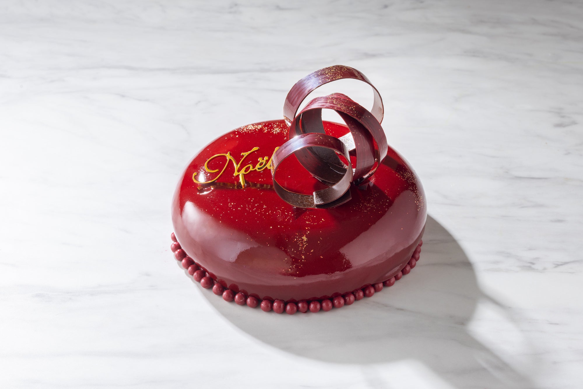 赤く艶めくグラサージュに包まれたカシスムースとあまおうのケーキ。バジルとカモミールが香る、華やかなクリスマスケーキで特別な夜を彩ります。