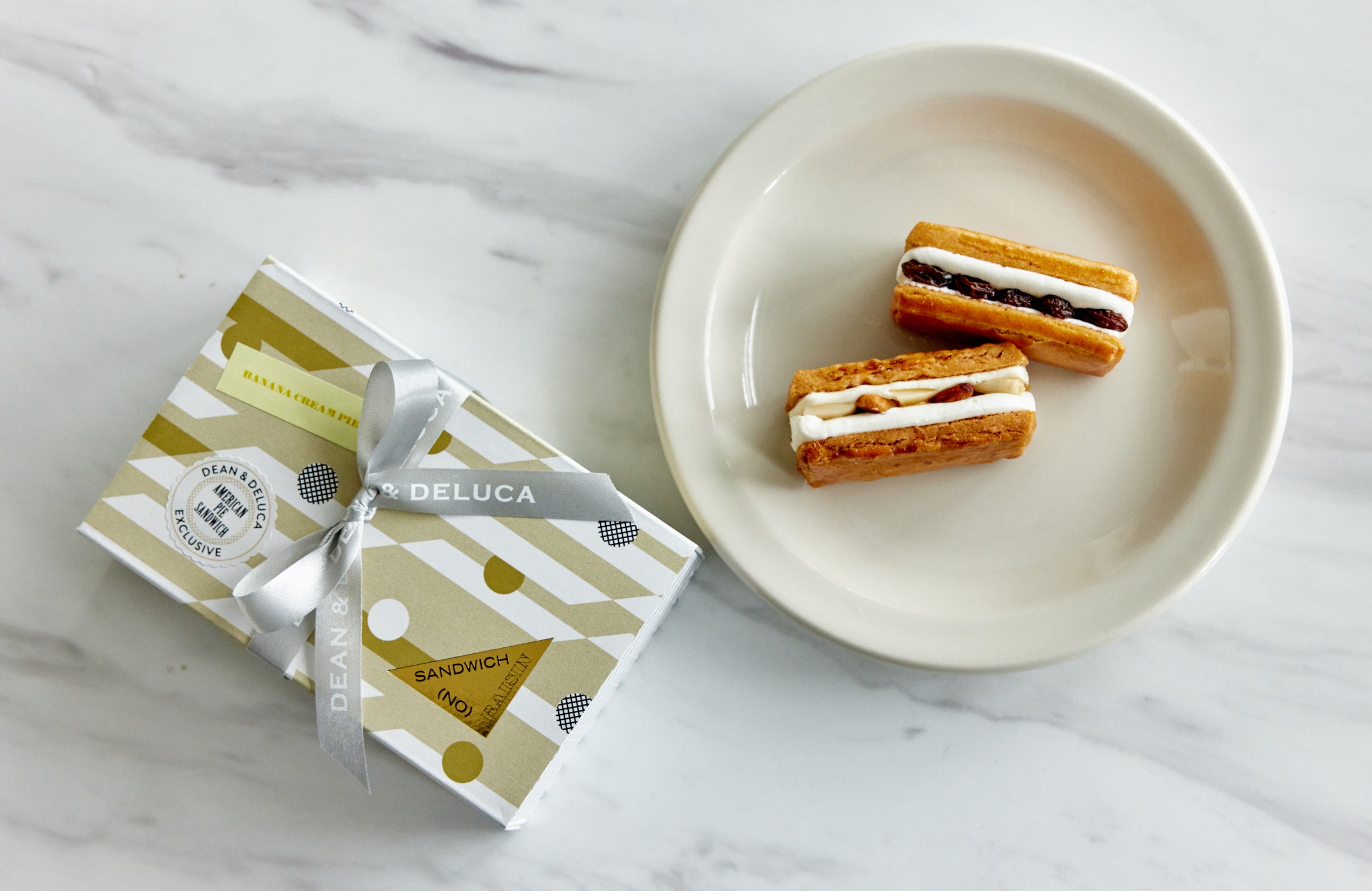 「レーズンは嫌いだけれどレーズンサンドを食べてみたい」というフードエッセイストの平野紗季子さんの願いから生まれたスイーツブランド『(NO) RAISIN SANDWICH』より、限定の特別なサンドが届きます。ニューヨーク生まれのDEAN & DELUCAらしいアメリカンパイをモチーフにしたバナナクリームパイのサンドです。