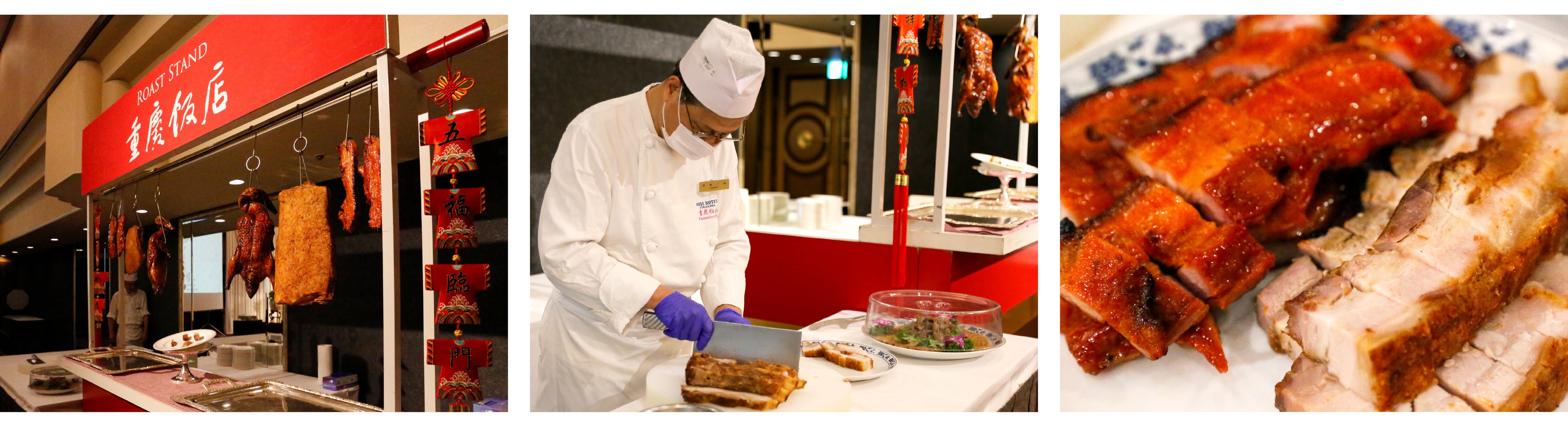 年の初めに相応しいお料理には、ローズホテル横浜自慢の洋食料理と横浜中華街 重慶飯店の中華四川料理に加え、ホテルパティシエによるデザートなどご家族みなさまで楽しめる多彩な料理が勢揃いいたします。2026年のシェフサービスは、重慶飯店本館売店で販売している焼き物をローズホテル横浜の会場にてお客様の目の前でカッティングする「チャーシュースタンド」にご注目ください。
