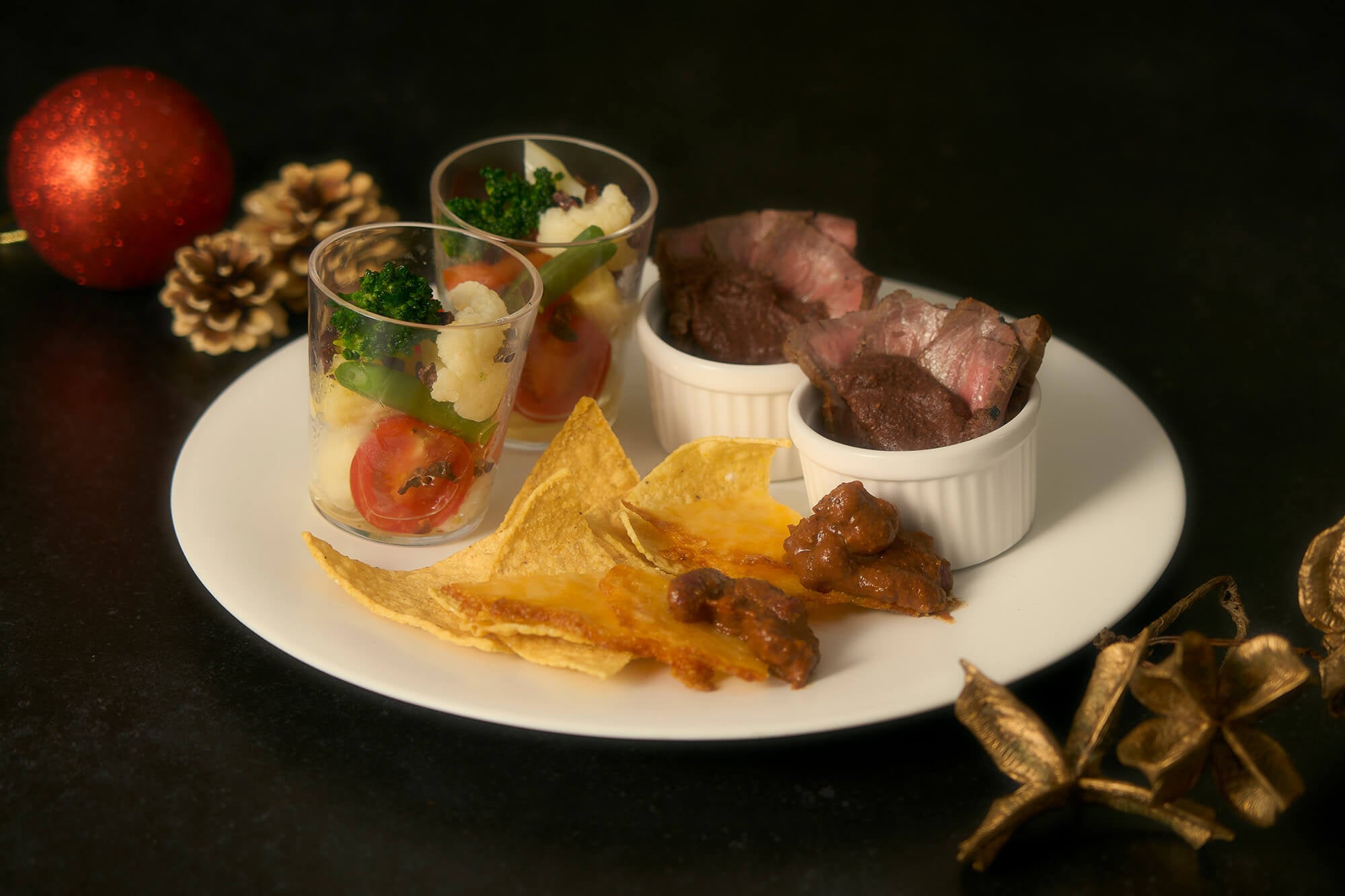 宮崎県産のお肉本来の旨味が引き出されたローストビーフをチョコレートソースと贅沢にお楽しみいただけます。ソースには赤ワインにペルー産カカオ豆を用いたチョコレートを使用して、濃厚なコクと深みを加えました。