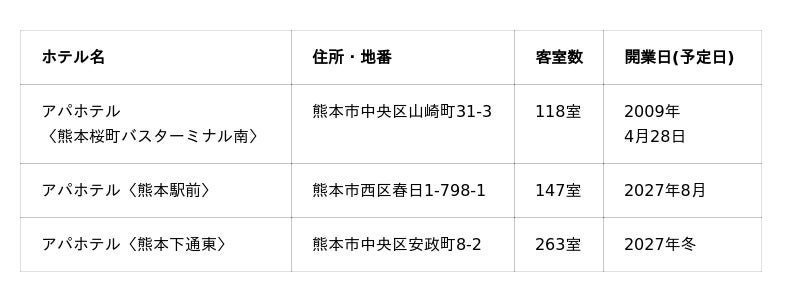 現在、熊本県内ではアパホテル<熊本桜町バスターミナル南>(全118室・2009年4月28日開業)を運営中で売り上げも好調であり、半導体関連企業が集積していることから交通網も整備され更なる経済発展が見込まれ、また自然景観が豊富で観光スポットとしての魅力も高く、2棟目の計画を進めることとなった。本案件のほか、アパホテル<熊本下通東>(全263室)も計画中であり 全3ホテル・総客室数528室 となる。今後も全国的に需要が見込めるエリアにおいては、ホテル運営・人員効率の向上を踏まえたドミナント戦略を積極的に行いながら、アパホテルネットワークの拡充を強化していく。