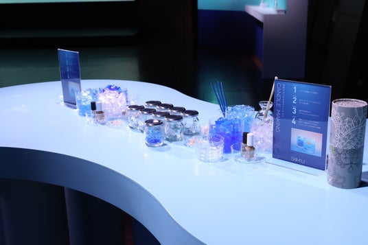 SAM'Uさんの、振って使う泡(バブル)タイプのトナーがありますが、まさにあの世界観がそのまま目の前に現れたような感じがしました。非常に清涼感があって、ブランドの爽やかなイメージにぴったりな空間だなと思いましたね。
