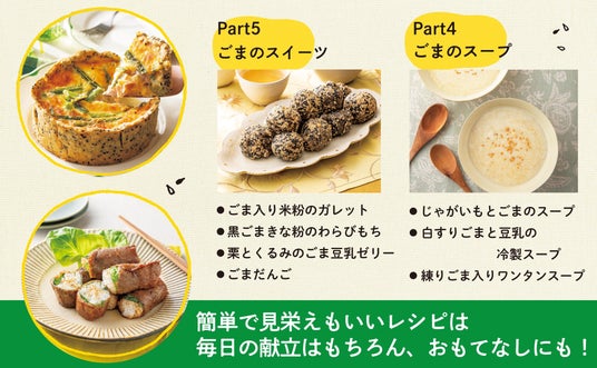 さらに本書には、ごまのコクと香りを活かした「たれ・ソース・ドレッシング」や「万能調味料」、「栄養満点ごまふりかけ」などのレシピも! 忙しい日でも、野菜にかけるだけ、ごはんにふりかけるだけで、おいしく栄養補給が叶うレシピはまさに保存版です!