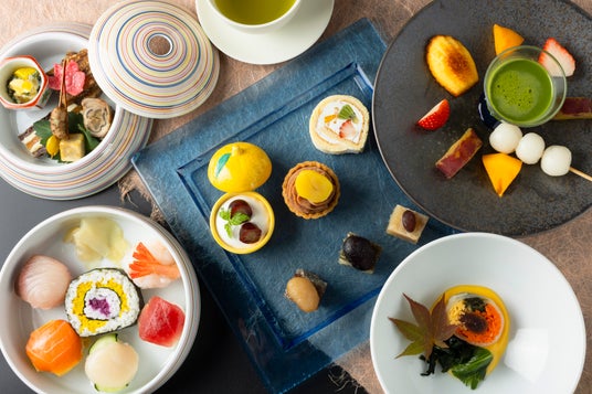 スイーツは「あんと茶と」の焼ききんつば<ゆず>・揚げきんつば<あずき>・<抹茶>の3種に、ホテルパティシエ特製のモンブランやパンナコッタ、濃厚な抹茶ソースで楽しむ抹茶フォンデュなど。
