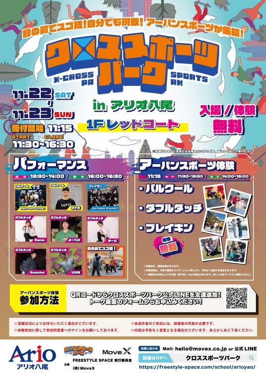 株式会社MoveX(本社:東京都品川区)は、親子で楽しめる体験型アーバンスポーツイベント「クロススポーツパーク in アリオ八尾」を、2025年11月22日(土)~23日(日)の2日間、アリオ八尾(大阪府八尾市)にて開催いたします。
