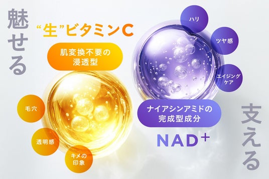 肌の変換過程を必要としない"生"ビタミンC(*1)と、ナイアシンアミドの前駆体 "NAD+(*2)"を組み合わせることで、肌表面だけでなく"肌土台"からのハリ・透明感をサポートします。酸化しやすい"生"ビタミンC(*1)を、毎回フレッシュな状態で肌に届けるため、1回分ずつ密封した個包装仕様を採用しています。