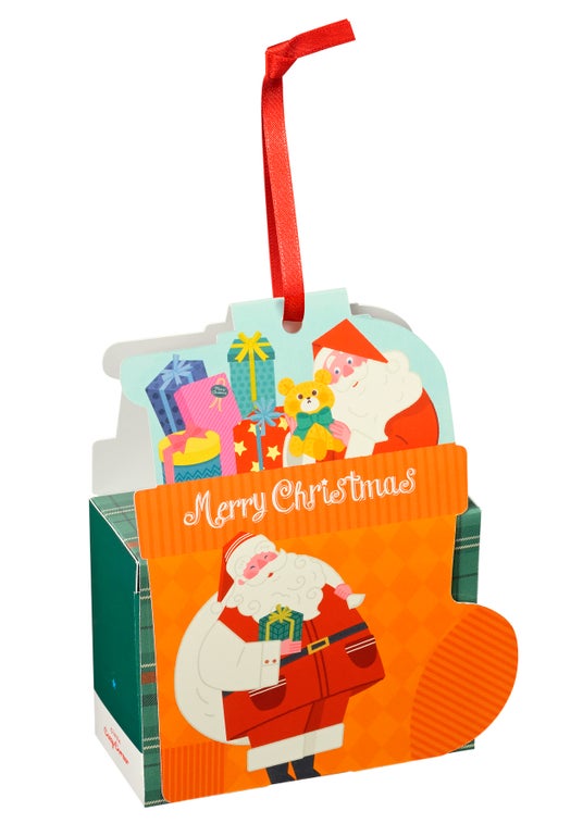 特長:プレゼントを入れる靴下をイメージしたボックスに、2種のクッキーをアソートしました。正面はサンタさんとトナカイとスノーマン、裏面は2人のサンタさんのデザインが楽しめます。