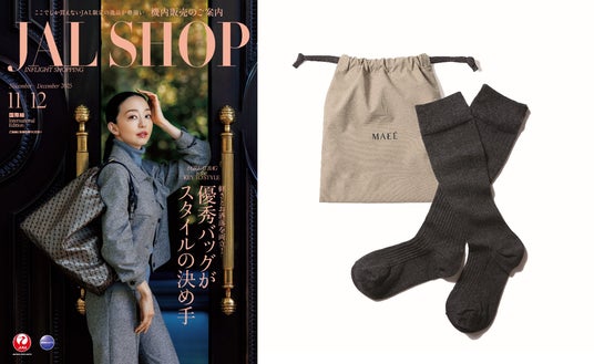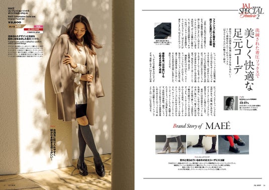 また、医療用品から始まったウェルネスブランド「MAEE」のコンプレッションソックスは、一般医療機器として、脚のむくみを予防・軽減する機能性を持ちながら、そのストレスフリーな履き心地と高いファッション性で注目を集めています。従来の着圧ソックスのイメージを覆す洗練されたデザインと良質な素材。そして、旅先や機内で一日履ける快適さが、客室乗務員やJALの関係者からも高く評価され、JAL国際線機内販売に採用される運びとなりました。
