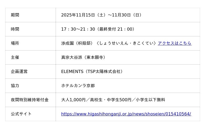 2025年11月15日(土)~11月30日(日)の期間で、京都・東本願寺 飛地境内にて「渉成園 夜間特別拝観『渉成園 秋灯り』」を開催します。(主催:真宗大谷派(東本願寺)企画運営:ELEMENTS(TSP太陽株式会社))