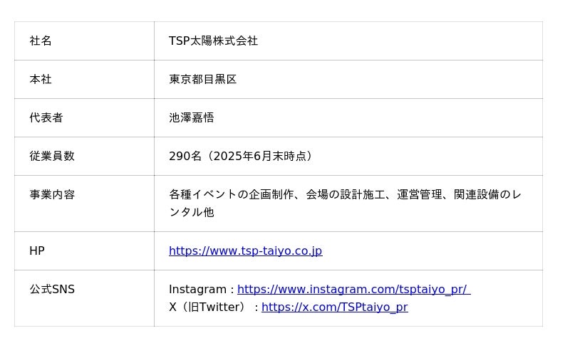 2025年で設立70周年を迎えたTSP太陽株式会社は、空間ソリューションによるイベントコンサルティングから企画・制作まで、あらゆる感動の場を一気通貫した支援で創造するプロフェッショナル集団です。国際的なビッグイベントを始め、あらゆるイベントに携わるデザイン・コンサルティング会社として、収益の最大化を図る事前収支計画から企画・クリエイティブ制作・建築設計・施工・運営までをトータルソリューションとして提供しています。PR・プロモーション・イベントに付随するホスピタリティサービスもお任せください。近年では、豊富な経験から培われた独自のノウハウを駆使し、ダイバーシティやSDGs・ESGへの取り組みを積極的に推進しています。