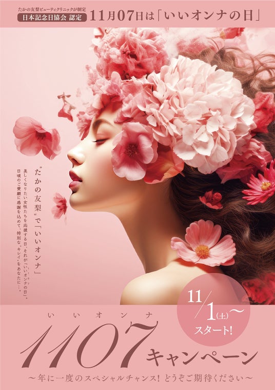 株式会社不二ビューティが展開するエステティックサロン「たかの友梨ビューティクリニック」(電話:0120-00-1107、インターネット:http://www.takanoyuri.com/)は、11月1日(土)より「いいオンナの日」を記念した1107キャンペーンを開始いたします。「いいオンナの日」とは、美しくなりたい女性を応援するために"たかの友梨"が制定した特別な日です。創業当時より「1107」を「いい(11)オン(0)ナ(7)」と読み、サロンの電話番号などに使用してきたことから、11月07日を「いいオンナの日」と定めました。日本記念日協会からも認定を受けています。