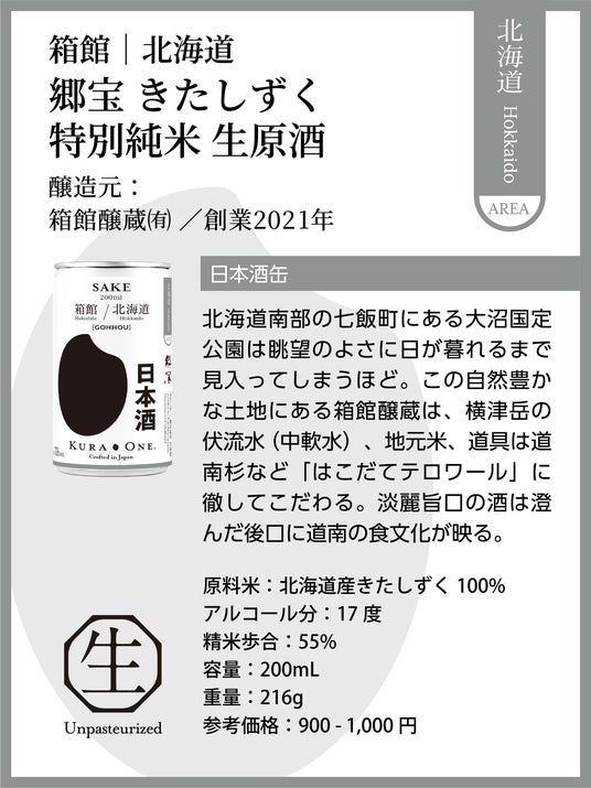 冷蔵庫に縛られない"生"を実現。開封の瞬間、仕込み水の清冽さと職人の判断が開きます。旅先でも贈り物でも、ベストの一口はあなたのタイミングで。