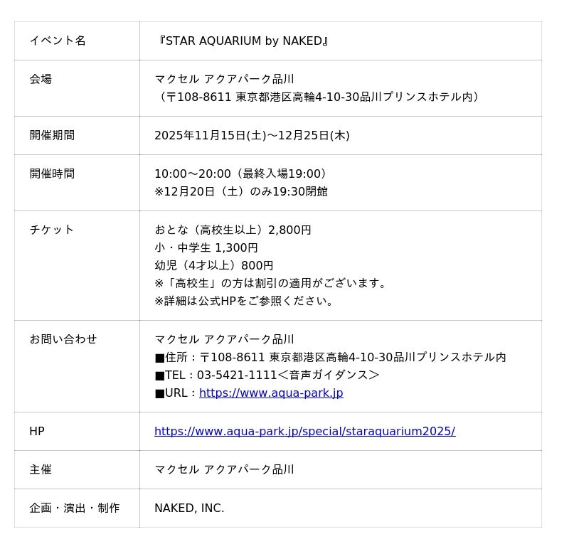 株式会社ネイキッド(英語表記:NAKED, INC. 所在地:東京都渋谷区、代表:村松亮太郎)は、マクセル アクアパーク品川にて、2025年11月15日(土)から12月25日(木)まで開催されるホリデーシーズンイベント『STAR AQUARIUM by NAKED』の企画・演出・制作を手がけます。