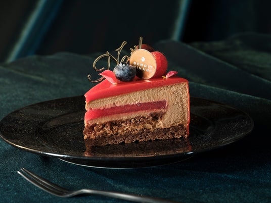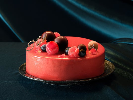 鮮やかなフランボワーズのグラサージュに包まれた中には、マダガスカル産カカオのチョコレートを贅沢に使ったなめらかなムースショコラと、しっとりとしたダックワーズショコラ。さらに、フィヤンティーヌショコラと、甘酸っぱいベリーのジュレがアクセントになっています。